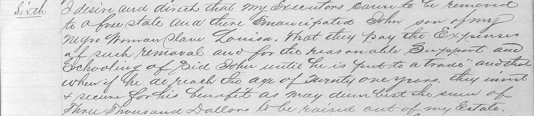 “I desire and direct that my executors cause to be removed to a free state and there emancipated John son of my negro woman slave Louisa. That they pay the expenses of such removal and for the reasonable support and schooling of s[a]id John until he is put to a trade and that when if he do reach the age of twenty one years, they invest and secure for his benefit as may deem best the sum of three thousand dollars to be raised out of my estate.”