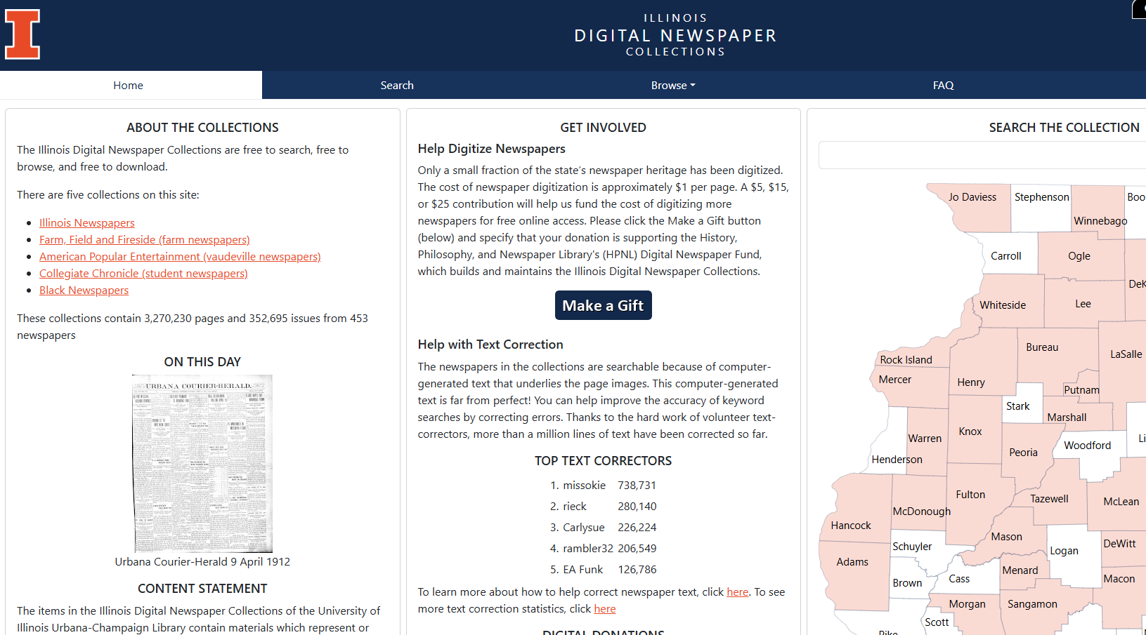 If you can't find the relevant papers on those sites—don’t give up! Many local libraries or universities have digitization projects. For example, the Illinois University Library has a digital newspaper project. For one locality, I was able to find all the relevant papers digitized at a county museum. This is why a locality guide can ensure you don't miss these regional resources.
