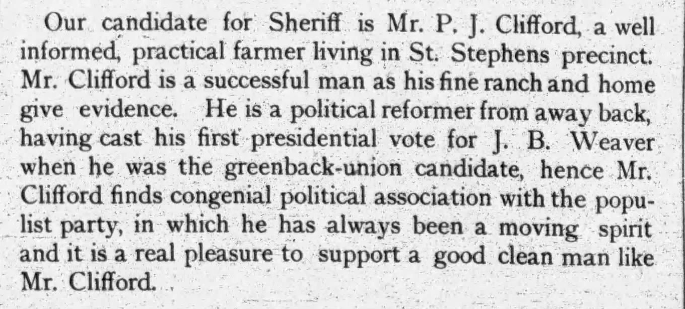 My great-grandfather ran for sheriff one year. He didn't win, and I certainly had no idea that the family may have been inclined to local law enforcement. I later found two of his sons listed in the county jail book—they seem to have been very different from their father. But following his election campaign painted a picture I would have never had. He ran under the populist ticket—an interesting insight into a man I never knew.