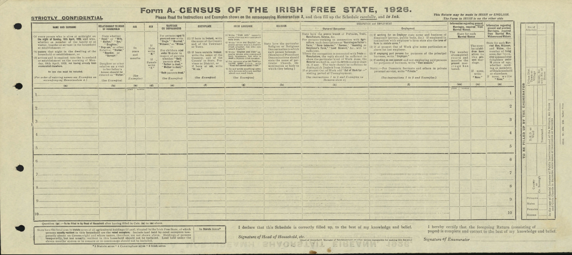 The 1926 Irish census was the first census taken in the Irish Free State (this does not include the six counties of Northern Ireland). Prior to that, the most recent census was 1911, taken while Ireland was still part of the UK. The gap of 15 years feels like an eternity in genealogical research. Per the Statistics Act of 1993, the census will be released 18 April 2026, one hundred years after it had been administered. The National Archives of Ireland has worked to digitize and transcribe the 1926 census in preparation for its release on 18 April. The census returns were digitized with archival-grade scanners to ensure a high resolution of the image. Then, using OCR (Optical Character Recognition) software the forms were transcribed, so that they are fully searchable. When the census goes “live” on the National Archives website you will be able to search for your ancestors by name, county, townland, district electoral division, or age.